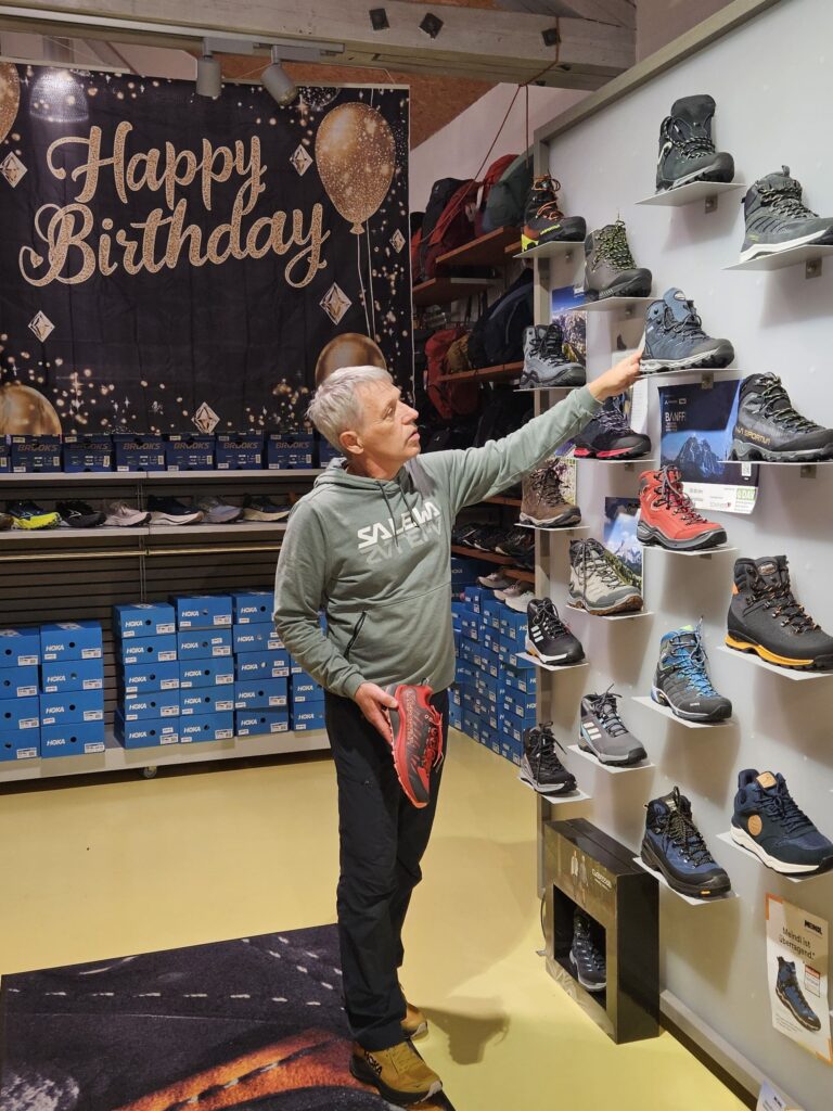 Das Angebot dort richtet sich seitdem an Kunden, die wie die Inhaber es lieben, draußen aktiv zu sein und dafür das richtige Outfit suchen. Egal ob Läufer, Walker, Wanderer, Pilger oder Alpenüberquerer. Aber auch Fußballer, Schulkinder und Hallensportler finden hier seit einem viertel Jahrhundert die richtige Ausrüstung für ihr Hobby. „Mit über 3000 Paar Schuhen der Marken Lowa, Meindl, La Sportiva, Hanwag, Salomon, Adidas, Puma, Nike, Hoka, Brooks, On… verfügen wir wohl über das größte Lager im ganzen Landkreis“, sagt Matthias Schirmer. Aber auch das Rucksackangebot, Wanderstöcke- und Sockenangebot kann sich sehen lassen. Ein feines Angebot an Outdoorbekleidung rundet das Sortiment ab.