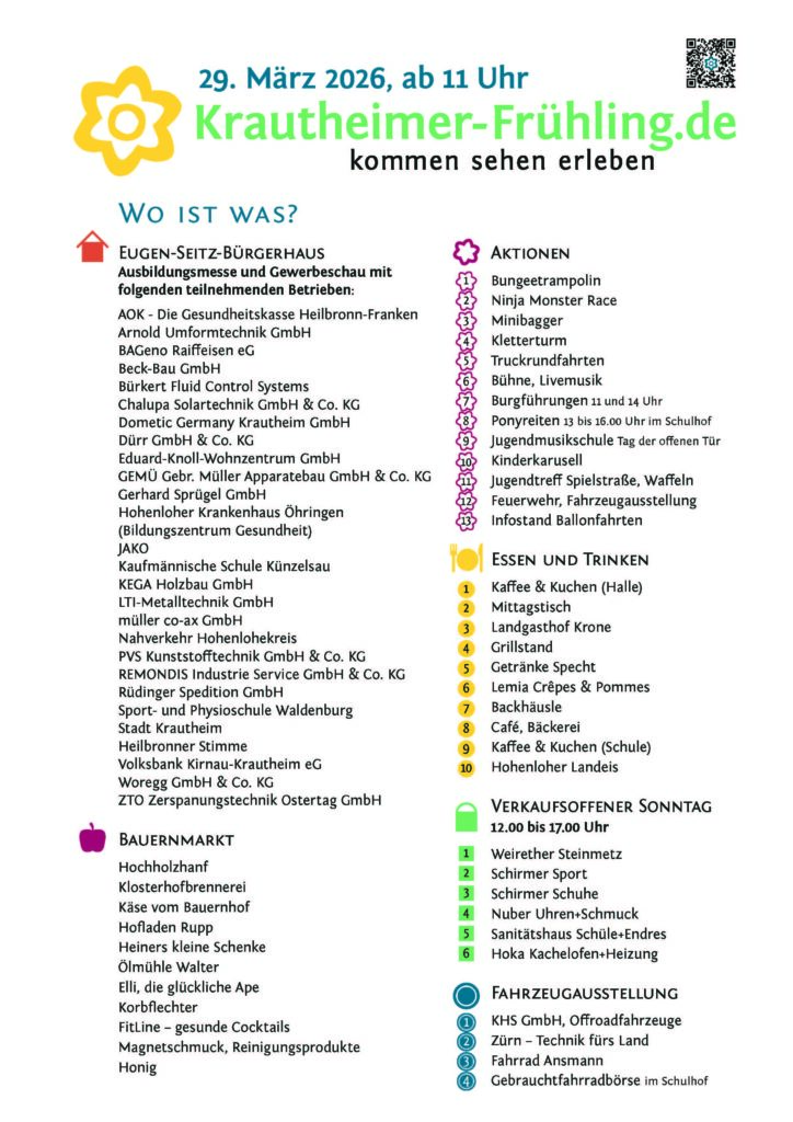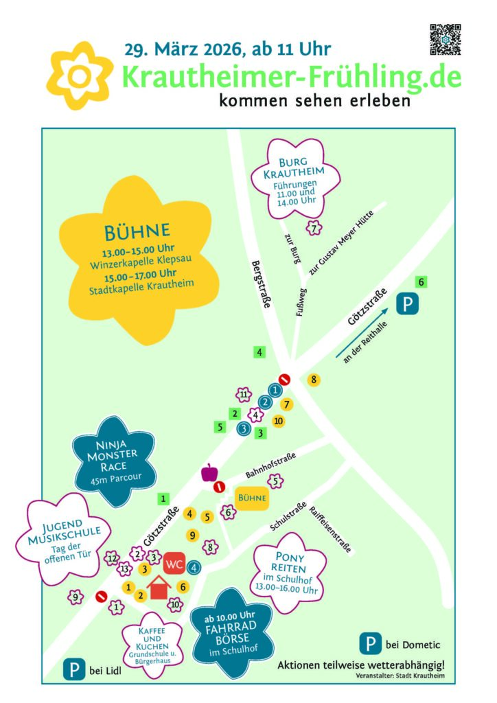 Am 29. März 2026 ab 11:00 Uhr findet in Krautheim wieder der beliebte Krautheimer Frühling statt. Die Veranstaltung verbindet Information, Unterhaltung und Einkaufsmöglichkeiten – und bietet damit ein vielseitiges Programm für die ganze Familie.